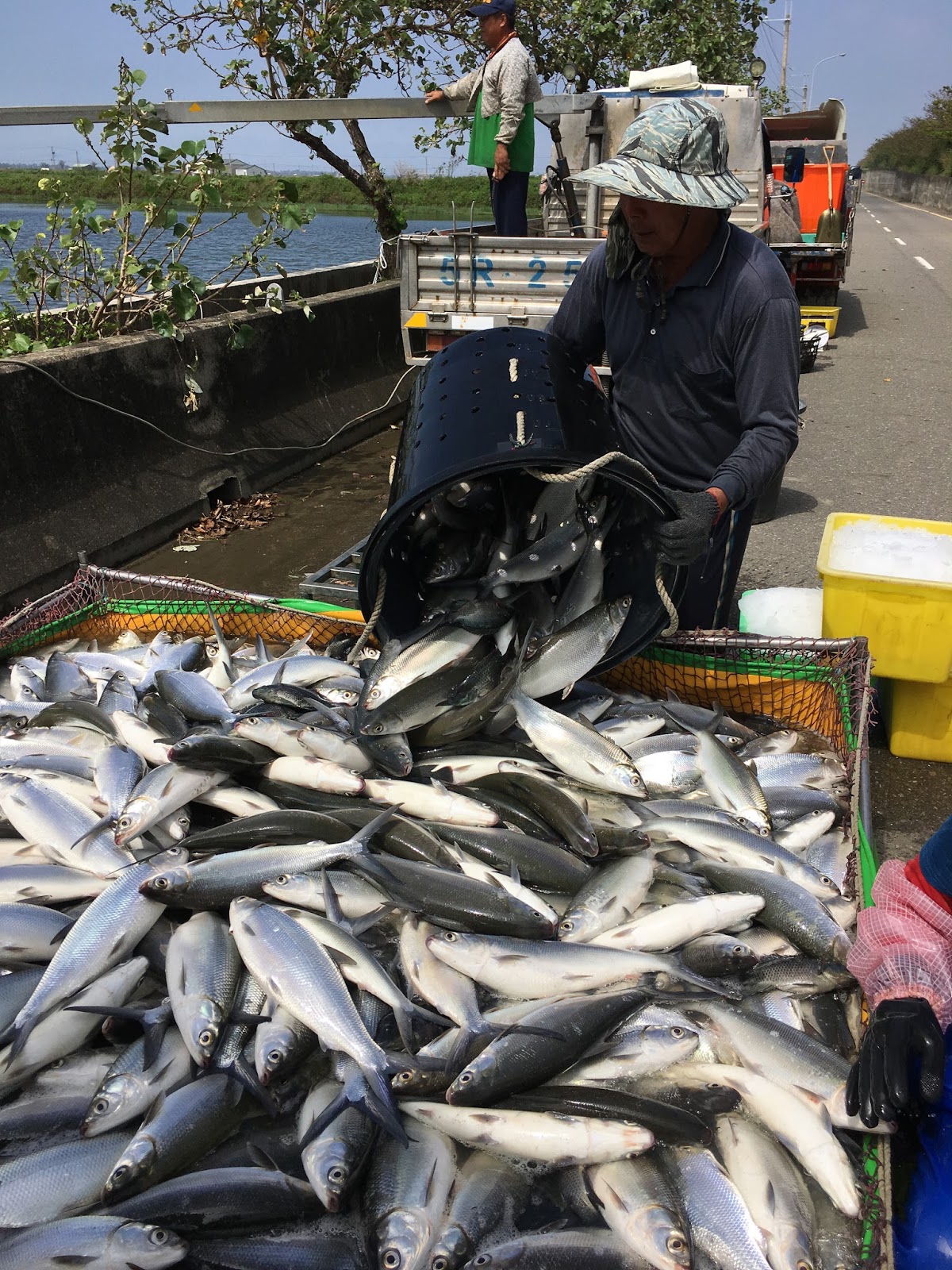 虱目魚捕撈,塑筏載著漁網,在魚塭撒網,兩旁各有三人牽網,緩慢拉網,會合集中收網,愈拉愈小,群魚擠躍水面,再將魚趕入ㄩ型網,並動用吊具拉網趕魚。接著電昏後,開始吊起,倒入水池。婦女取魚分級裝筐,專人拉筐,至貨車旁,裝箱(保麗龍)加冰塊,膠帶封緊,排放貨車,待數量完成,於傍晚出貨,運交訂貨者。