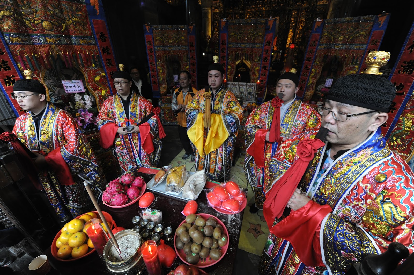 上午九點,豬公車隊繞三峽市街,經老街外圍道路進入廟埕,排列廟埕中央,一字排開,神豬前皆有北管樂團演奏。大殿道士團先祭天公,後祭祖師公,爐主跟拜。