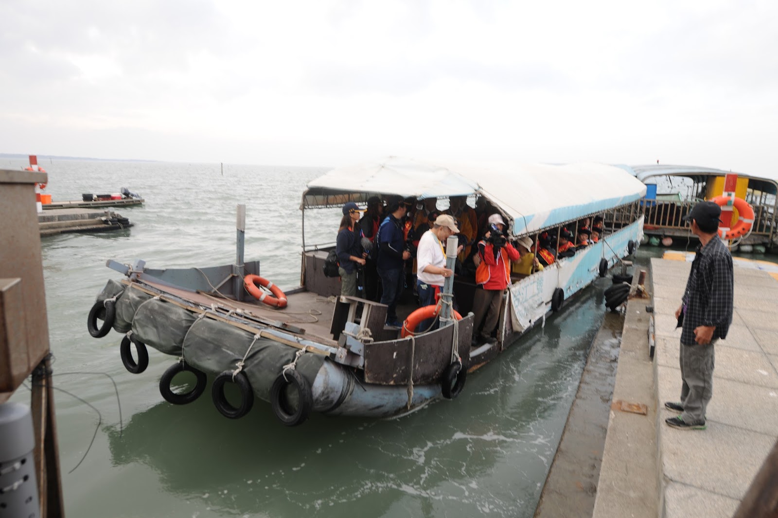 穿梭瀉湖,兩旁都是蚵架,抵外海前折回,各會首就在船艙兩旁施放水燈後,返航碼頭,收拾祭品,搭車回廟。道長為大士山開光,並作些科儀,會首跟拜,至此禮成。