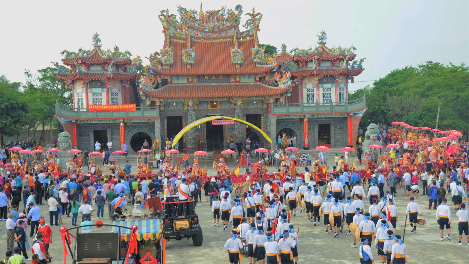 台南市安南區土城聖母廟,三年一科遶境,二0一八年五月四日早上六點二十分蜈蚣陣抵達廟埕,會長拈香接駕,獻果後,圈繞廟殿三圈後出發。