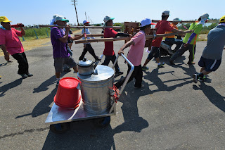 二0一八年九月二十二日下午一點,四轎、令旗恭請王船出航,開水路後,主事者握布繩牽拉王船,前往村西的王船碼頭,定位後,張掛三桅木帆,堆放金紙及添載物裝船。